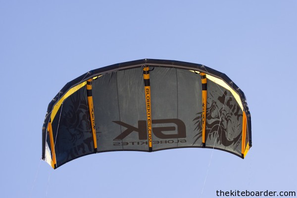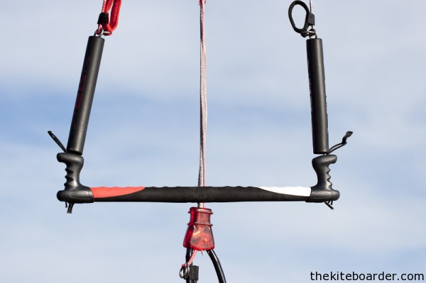 The 2011 GK bar is essentially the same as the 2010 bar, but the quick release now has a small trigger to make it easier to reassemble than last year. The bar features a push away quick release, adjustable stopper, above bar depower strap, and a molded grip. Our 9m test kite came with a 53 cm bar and 21m lines.