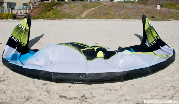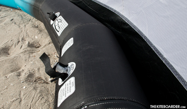 The Lithium Zero is a medium-low aspect strutless kite that is the largest of all the kites in this year’s light wind test. The Lithium Zero features the standard 9mm inflation / 11mm dump valves, double ripstop trailing edge, five rear pigtail knots and one front pigtail knot, with two turning speed attachment settings on the wingtip as well as a non-adjustable front bridle which is fairly long in length. The Lithium Zero has tons of low-end power when properly sheeted, medium bar pressure and good turning speed for a kite of its size. Strutless kites tend to offer ambiguous sheeting feedback, but the Lithium Zero sheeted more like a standard kite, and earned solid praise for its performance in the lowest winds.