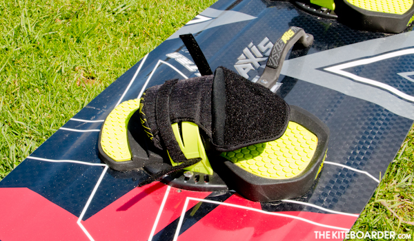 The Ultra came with the UTS pads and Pro Straps. The pad density is plush with good honeycomb grip and a pronounced ridge for toe grip. In addition to dual density EVA foam, Axis integrated a unique 4mm thick Poron XRD insert under the heel to help absorb impact loads. The Pro Straps have four Velcro adjustments under the protective flap for front and back strap tension with greater contact on the foot and good side support. One tester reported discomfort from the straps, but other than that, the pad and strap combo scored very well with most testers.