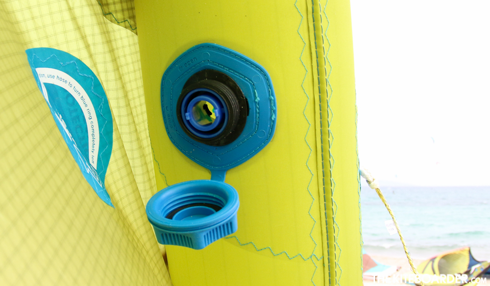 This year we are told that the Evo has evolved into the four line version of the Rebel, a medium aspect 5-strut kite that excels across all disciplines. We tested the Evo in the four-line kite mode (it can be rigged in a five-line configuration). The Evo features North’s large diameter inflation valve that connects directly with the standard pump hose without the use of a nozzle. The inflation system’s twist valve twists with the insertion and removal of the hose and makes inflating and packing up quick and easy. The Evo comes with a single setting front bridle with pulleys and three steering settings on the wingtip as well as an 11 inch batten on the trailing edge between the two outside struts. Testers seemed to love this kite for it’s smooth and progressive power, quick turning, easy boosting and solid upwind ability. Compared to the Rebel, the Evo’s sheeting range travels a larger area of the bar’s throw to access its power band, but the Evo performs similarly in the boosting department with user-friendly steering and sheeting and much better unhooked performance. The Evo when compared to the Dice seems to fly farther forward in the window and offers greater depower for riders who might choose this kite in the waves. Overall, the Evo earned high praise from our testers for riders of all levels looking for a fun freeride and big air freestyle kite.