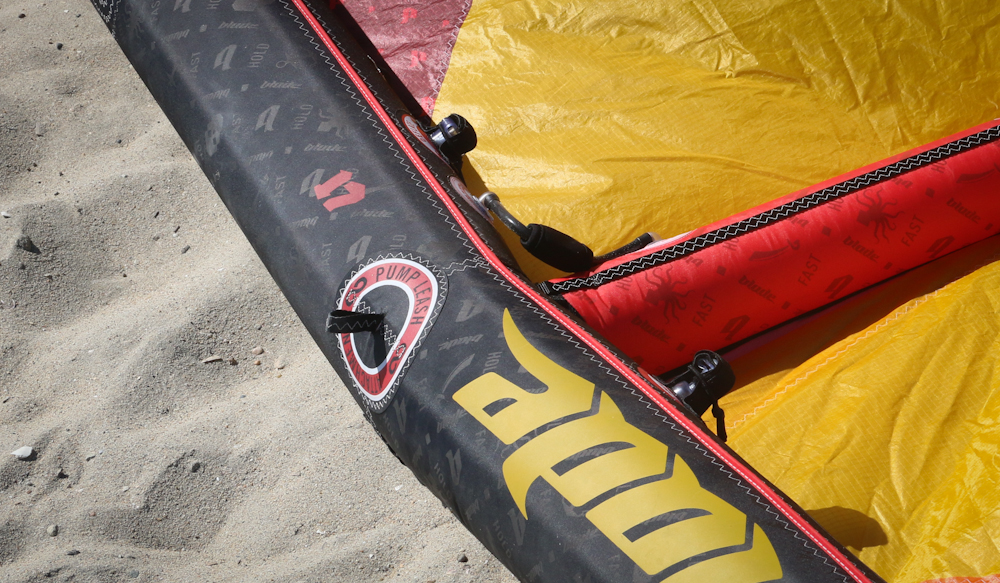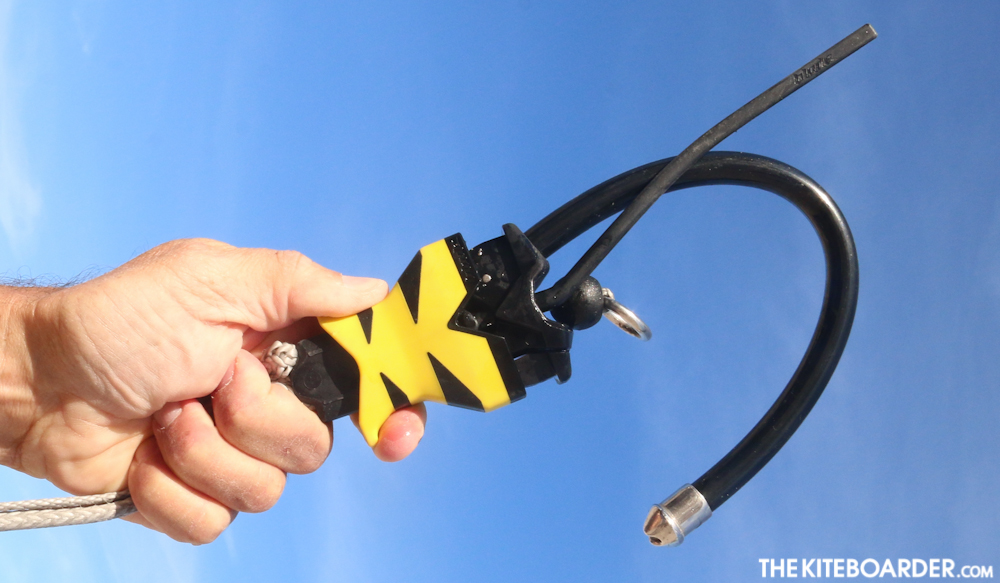 The Fat Lady came with adjustable dual length bar-ends, a single center-line safety depower, spectra sheeting/throw line with sliding stopper and an above bar tuning cleat that can be adjusted to accommodate longer throw length without disturbing the kite’s tuning. The safety release is a simple non-rotating push away quick release with travel guard and an above the bar swivel with low V. The outside lines are tunable under the floats, with non-retractable winder bungees. Testers like the thin diameter grip and fairly firm texture and didn’t seem to comment on the upward kink in the bar, but did say they would have liked a slightly wider stance for this size kite.