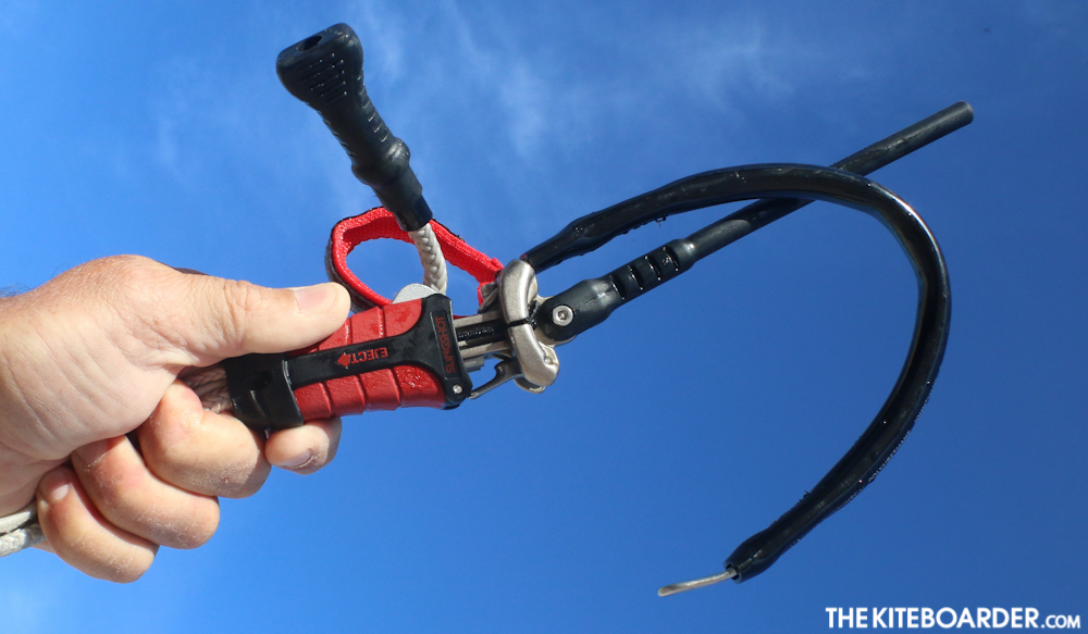 The Turbine came with the Compstick, a simple yet feature rich fixed length bar (43, 50, 58cm) that uses a single center-line safety depower, spectra sheeting/throw line, low V, sliding stopper and below the bar cleat tuning integrated into the push away quick release. There’s no travel guard or below the bar hand swivel but the quick release is compact and keeps a large amount of throw travel within reach of the rider. There’s an above the bar swivel, adjustable length throw and the only bar in our test that featured dual outside line OS handles. Testers liked the smaller diameter grip, mild texture and raised volcano at the insert to avoid pinched fingers. Many of our testers were not familiar with below the bar tuning, but by placing it on the side of your favored arm and sheeting out when adjusting it’s fairly easy to trim the kite.