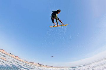 With your kite high in the window, sit back in the water and hold your board downwind. Push your hips up towards the surface of the water, bend your knees, and begin by placing one foot in a foot strap. Once one foot is in, bring the other foot up and place it in its strap. With both feet in the straps, make sure your board is perpendicular to your kite’s pull and bend your knees.