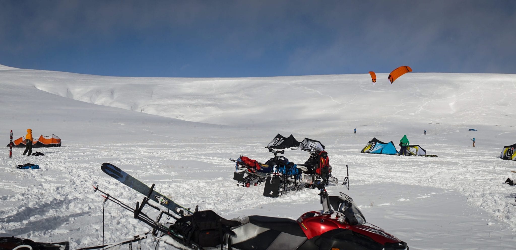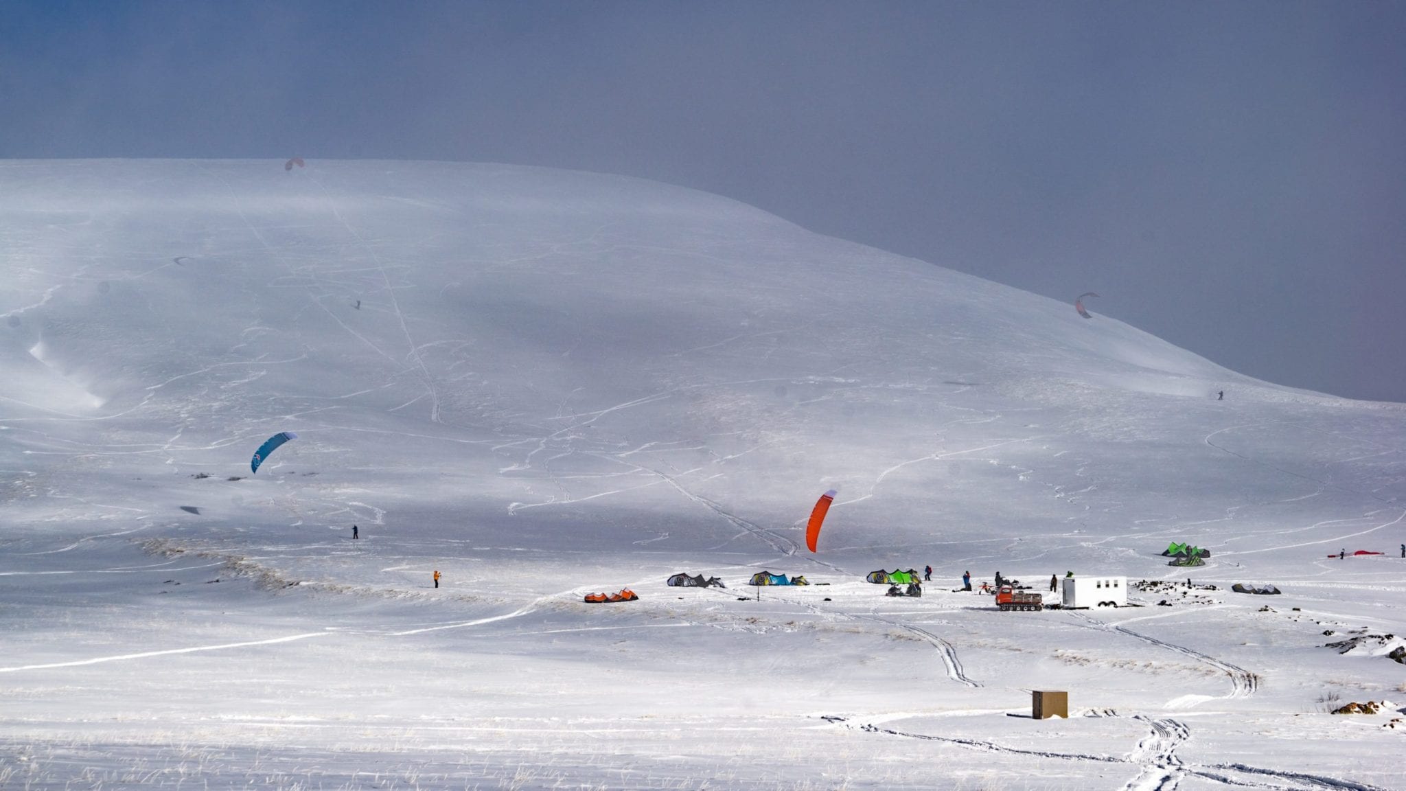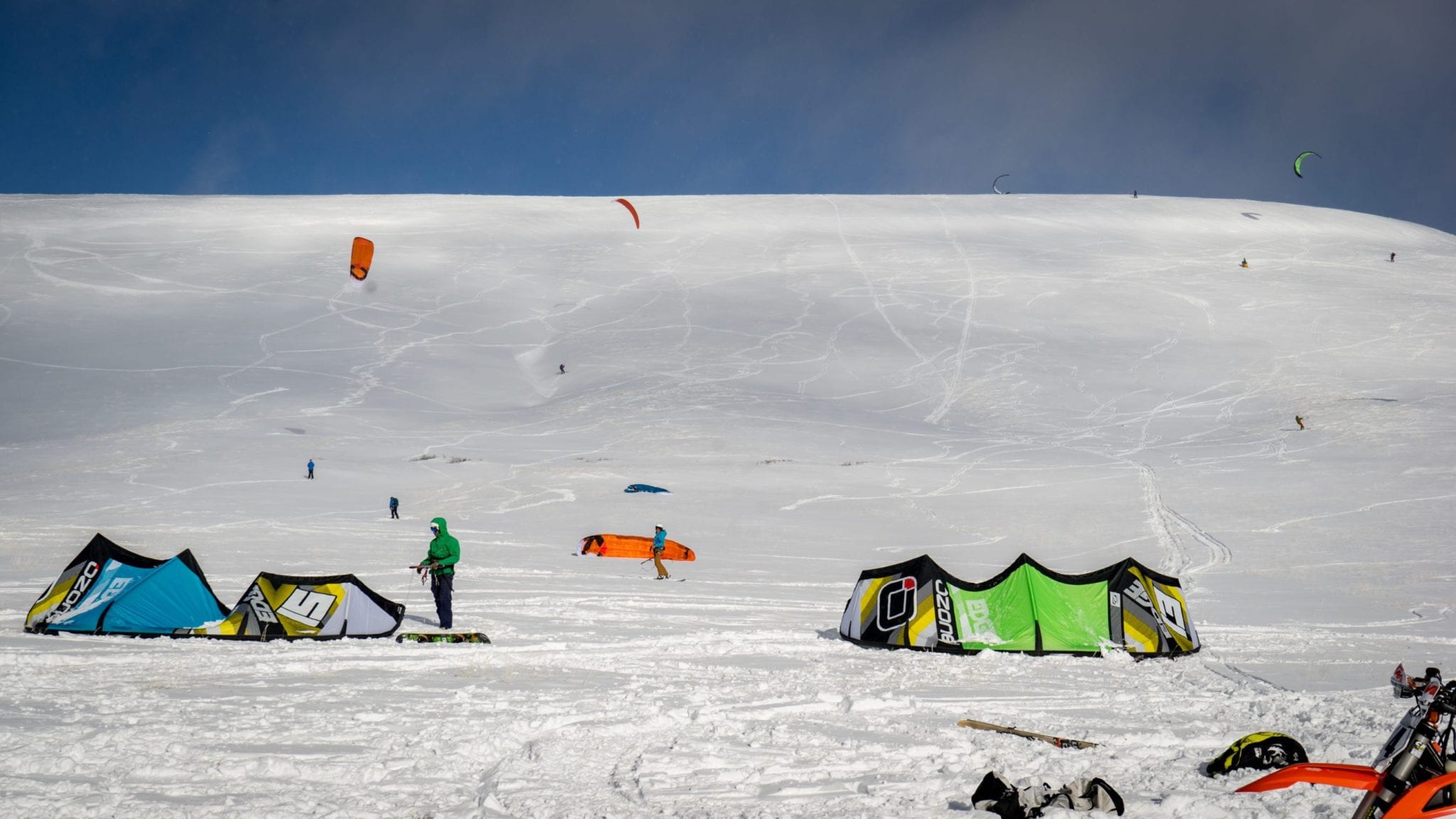 For seven days Summiteers roamed the expansive powder fields surrounding Bald Mountain and satiated our need for untracked snow and wind. Some days were light wind and we used our biggest kites - 15 to 17m foils and inflatables. Other days were perfectly suited to tens and 12m kites. One day was a nukefest – a snow storm with sustained 35mph winds (50+mph gusts!) which generated a full day of sub-zero whiteout conditions. The lack of visibility and cold kept all but a couple intrepid souls confined to the refuge trailer that was situated at the daily kite spot.