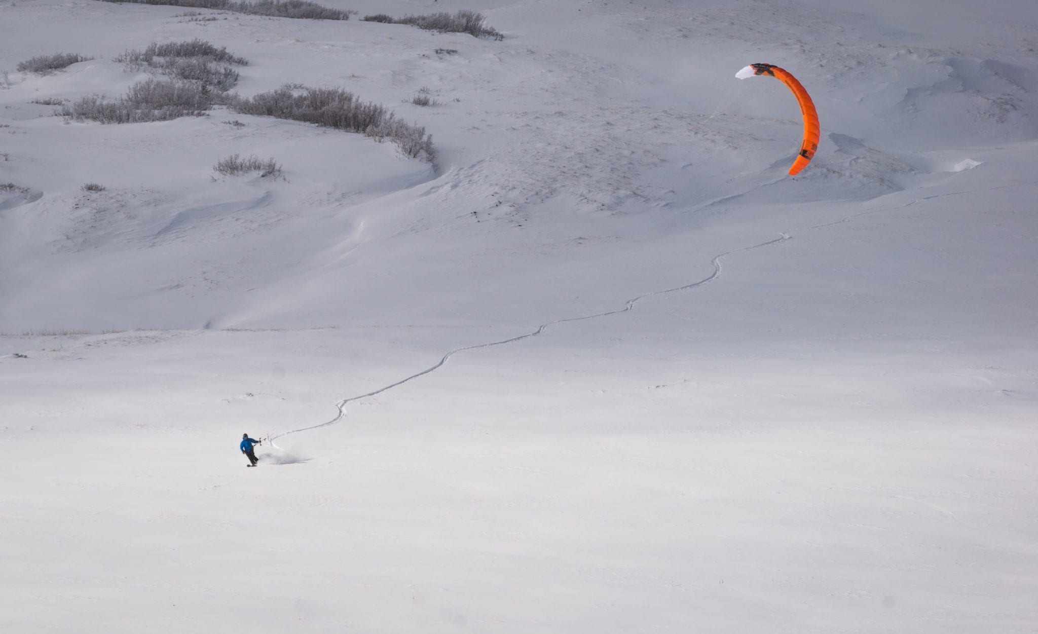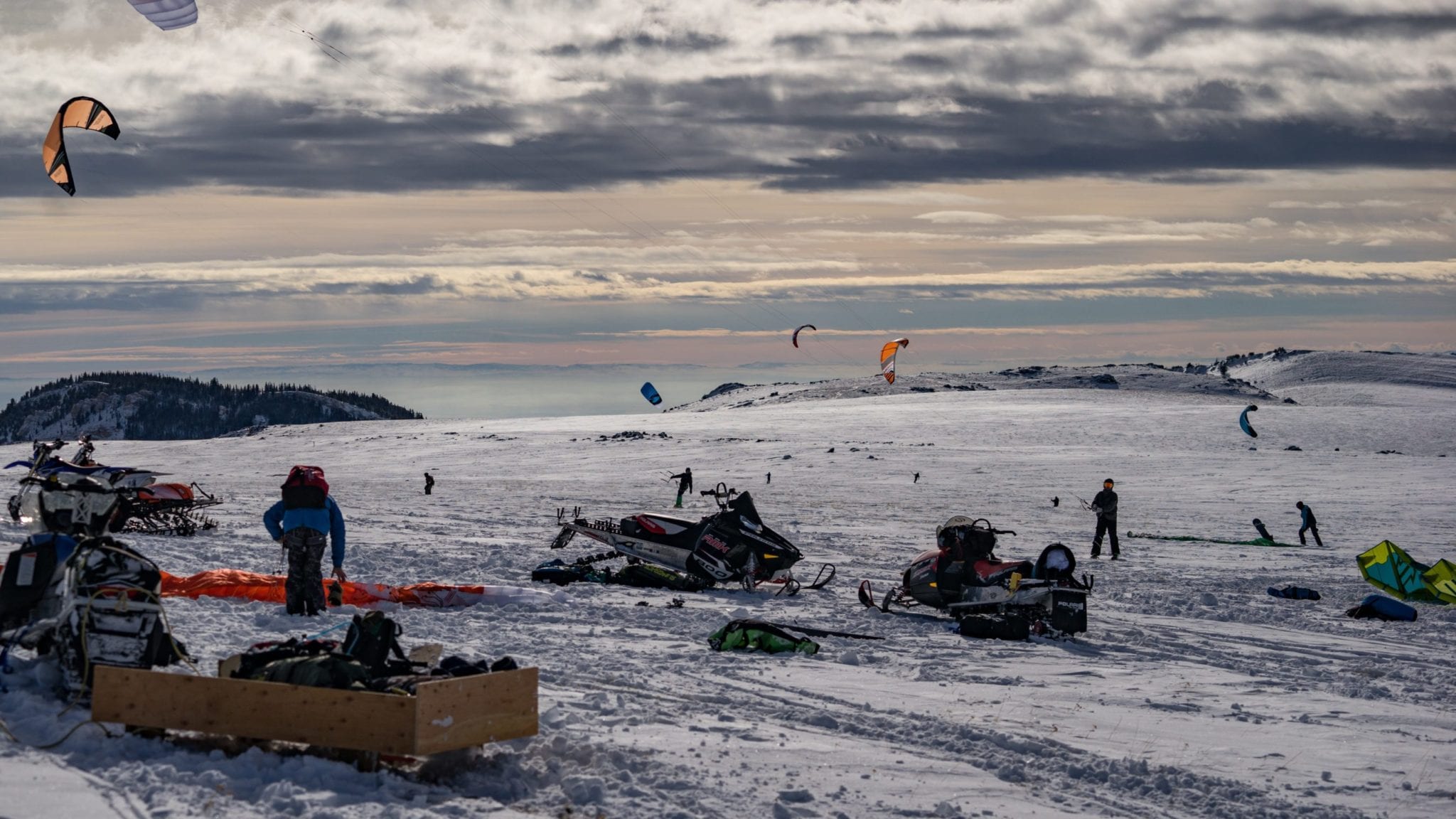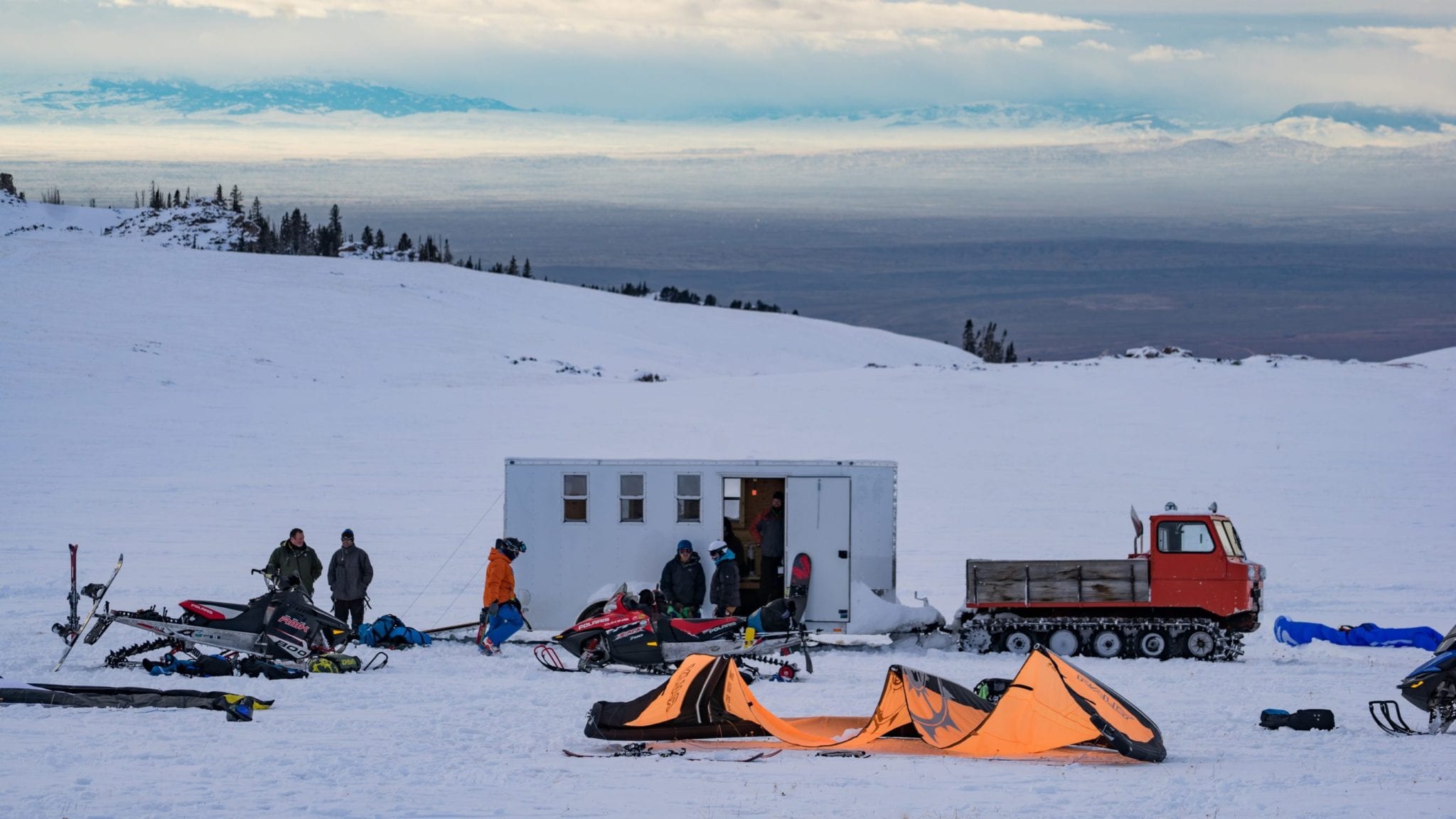 For seven days Summiteers roamed the expansive powder fields surrounding Bald Mountain and satiated our need for untracked snow and wind. Some days were light wind and we used our biggest kites - 15 to 17m foils and inflatables. Other days were perfectly suited to tens and 12m kites. One day was a nukefest – a snow storm with sustained 35mph winds (50+mph gusts!) which generated a full day of sub-zero whiteout conditions. The lack of visibility and cold kept all but a couple intrepid souls confined to the refuge trailer that was situated at the daily kite spot.