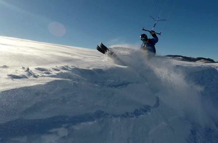 My decision to hit Antelope Flats was easy. I had watched the exiting snow storm, I had seen the ‘transition day’ set up and the weather models were all clear for high pressure. It was then I made my decision to drive to the ‘Flats’. My arriving early meant getting up pre-dawn and making the drive in the dark. Still I arrived before 10am and got in a superbly powered session on my 12m Ozone Summit. There were a few kiters already there and together we roamed the hills out towards the Snake River. Here we put on a boost-fest for ourselves smashing every wind lip and grinding every cornice line we could find. With wind that is so smooth and consistent, snowkiting becomes a different sport as one can really use every kite handling skill they knows with unfailing confidence.