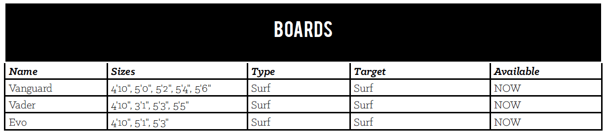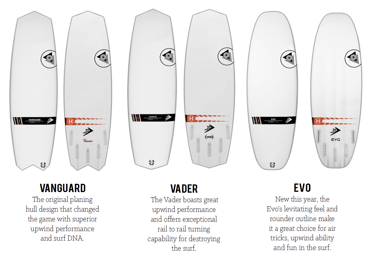 The Vader and Vanguard utilize similar design concepts to create lift and each has their own positive attributes. All three of the boards carry a parallel outline which work well to catch the wind under the board due to the extra surface area when performing freestyle tricks. Because the shapes are ridden much smaller than traditional boards they fit into the wave face differently and are beneficial in areas with river surf or for attacking waves in a new way.