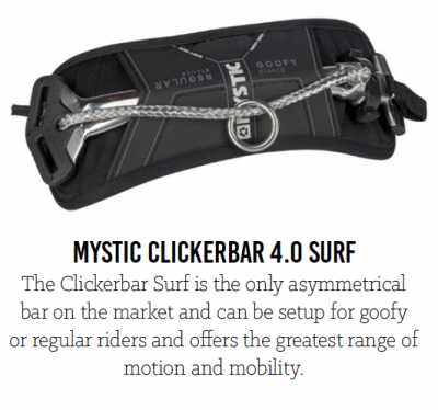 In order to give the rider the greatest possible range of motion the designers designed the bar with the widest possible span of rope. The closure mechanism on the Clickerbar takes up some space on one side of the bar so the rope can’t go right to the edge of the bar on that side. Rather than centering the rope on the bar the design team decided to extend the rope to the outside of the bar on the opposite side from the closure mechanism and this created an asymmetrical bar. The rider can take advantage of this extra travel by setting it up one way or the other for either goofy or regular stance. Setting it up this way gives the bar a little extra travel when the rider is toeside and really gives the rider the maximum benefit of the rope spreader bar set up. It’s actually a lot less complicated than this sounds. The rider sets it up once goofy or regular and never touches it again.