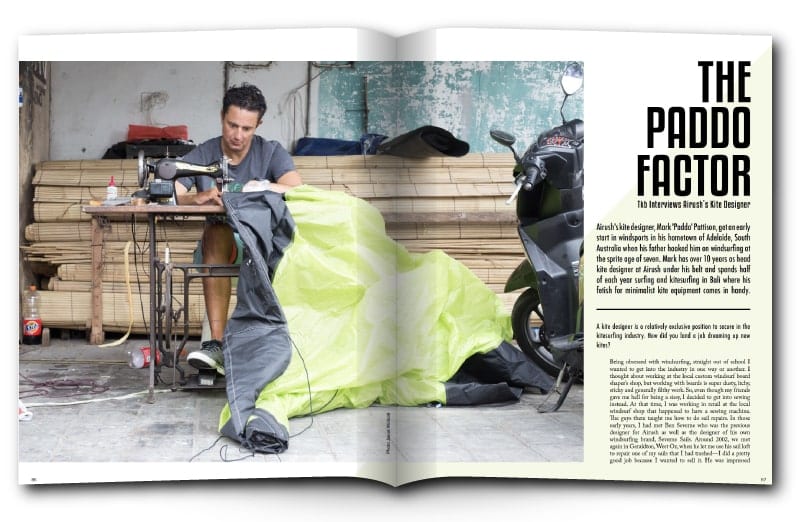 Being obsessed with windsurfing, straight out of school I wanted to get into the industry in one way or another. I thought about working at the local custom windsurf board shaper’s shop, but working with boards is super dusty, itchy, sticky and generally filthy work. So, even though my friends gave me hell for being a sissy, I decided to get into sewing instead. At that time, I was working in retail at the local windsurf shop that happened to have a sewing machine. The guys there taught me how to do sail repairs. In those early years, I had met Ben Severne who was the previous designer for Airush as well as the designer of his own windsurfing brand, Severne Sails. Around 2002, we met again in Geraldton, West Oz, when he let me use his sail loft to repair one of my sails that I had trashed—I did a pretty good job because I wanted to sell it. He was impressed and offered me a job. At first I just helped build prototype race windsurf sails, but soon I was helping Ben with all the Airush kites and bars, building prototypes as well as testing them on the water. Around 2006, Ben wanted to concentrate on his windsurfing products so I started designing the kites myself. It was really hard at first, but I had a lot of help in the beginning and after a few years it started to become easier and things made more sense.