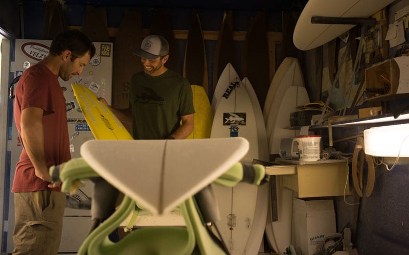 Jason Slezak talks shop with Fletch in his Ventura-based surfboard foundry where the FCD team painstakingly cuts foam, glues stringers and lays all their own glass. // Photo Scott Soens