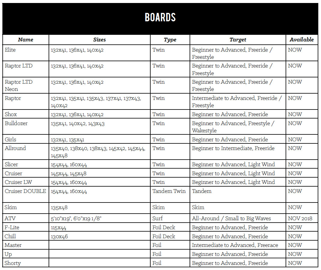 This year we added the 2019 Slicer. In a nutshell it is a full-carbon version of the Cruiser LW, our most popular light wind board. The shape is new this year, improving the LW design with sharper squared tips for a little bit more surface area and step-cap technology to get that slightly sharper rail for better edging while keeping the center of the deck stiffer so the board keeps its flatter rocker under pressure. While the Cruiser LW retains its fiberglass layup and lower price point, the Slicer is a full carbon layup like the Raptor LTD and much lighter, saving nearly a pound and a half on the smaller 154 size compared to the Cruiser LW (which is not a heavy board to begin with).
