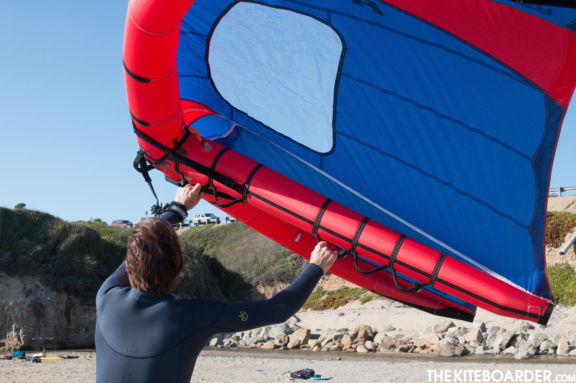 There are a ton of small differences in this year’s wing that improves the overall experience, yet much of the Wing-Surfer’s balanced DNA was still very much apparent from our first tack on the water. While the new Wing-Surfer has added a deeper profile or draft to the wing, it still has a very efficient forward flying feel that excels at rocketing upwind. Although they beefed up the design’s airframe rigidity, Naish has done so without expanding the size of the inflatable spars so you still have that high angle of attack and solid penetration into the wind while keeping material weight down. The deeper draft with the luff strut does a good job of adding some low-end power, making the Wing-Surfer feel a little less on/off and providing smoother power delivery as you sheet in. There’s a careful balance here and Naish does an excellent job of adding low-end without sacrificing its notable upwind abilities. The Wing-Surfer seemed really stable and locked in while going upwind and the wingtips seemed to stay clear of the water, never snagging and causing unnecessary crashes.