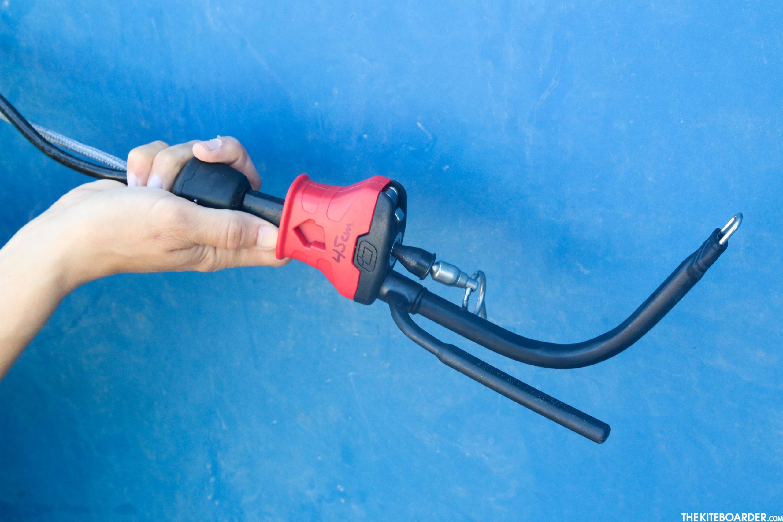 The Contact Water V4 control bar has been Ozone’s go-to bar and it’s seat belt ”˜Click-In Loop’ system is one of the slickest quick-release mechanisms on the market. The Contact is a fixed-length bar (available in 38, 45, 50 and 55cm sizes) that can be purchased with a vast array of line lengths options (12, 15, 21, 23, 25, 27m). The center line pigtails end in a lark’s head loop and the wingtip lines end in a knot. The Contact features a single centerline safety system that runs alongside the power/throw line, down through the bar and into the quick release. The power/throw line is PU covered for longevity and features a low V split on the center lines. The center lines end in grey color-coded pigtails with loops for rigging purposes and the outside lines end in knots color-coded with red and blue pigtails. The Contact features above the bar tuning with a cleat and a small toggle that uses a bungee built into the tuning line to keep things clean in depowered situations.