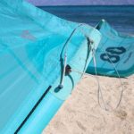 The Bandit XV comes with the Reactor inflation valve which offers a high flow connection that twist locks the pump hose to the kite for easy and super-fast inflation and deflation at the push of a button. There are a number of brands that are now using this system as it has proven itself very reliable; just be sure to remember to tap the push button into the closed position (with the button sticking out) before you start pumping or you will lose all your pressure when you remove the hose. This year the single setting front bridle only uses a single slider, which has been upgraded to a stainless-steel slider, as well as a Dyneema sheathed bridle line to improve longevity. Both the front bridle and wingtip pigtail connections end in knots, but the wingtip utilizes a bridle that has two knots for adjusting the effective connection point forward or aft on the wingtip. The top knot moves the connection back, lowers bar pressure and increases maneuverability. The bottom knot moves the connection point forward, increases bar pressure and reduces maneuverability. The stock steering setting comes with the bridle connection point set to be farther back.