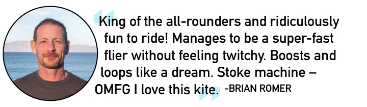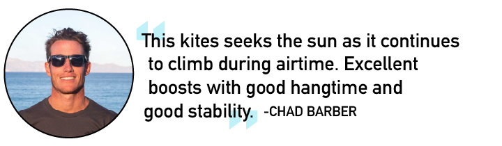 The steering on the Bandit XV retains its super quick steering response, with a turning arc that is a bit wider than the Bandit S, but perhaps a little tighter than the looping arcs of Bandit models of years past. With a slightly tighter turn, the Bandit XV dispenses a balance between power generation during turns and swift turning and easier kite placement. Much of the focus for 2022 was to highlight the Bandit’s big air boosting power, and when you’re ready to send big jumps, the canopy feels incredibly efficient and accelerative and the steering is noticeably swift and intuitive, so it’s easy to find the kite’s perfect launching trajectory in just a few attempts. The small incremental improvements to canopy stiffness become more apparent when you begin to really push the higher-end power of the airframe, but the crisp lifting forces and height of boosts were really inspiring and the accelerative lift was matched by insanely good hangtime. In recent years, the Bandit has done a great job of balancing airframe stability with light weight build to maximize the airframe’s agility, but what we noted most was how the canopy transfers every bit of lift into your harness. With the impressive steering response combined with good hangtime we found it easy to extend big airs and manage soft landings without too much focus on the kite.