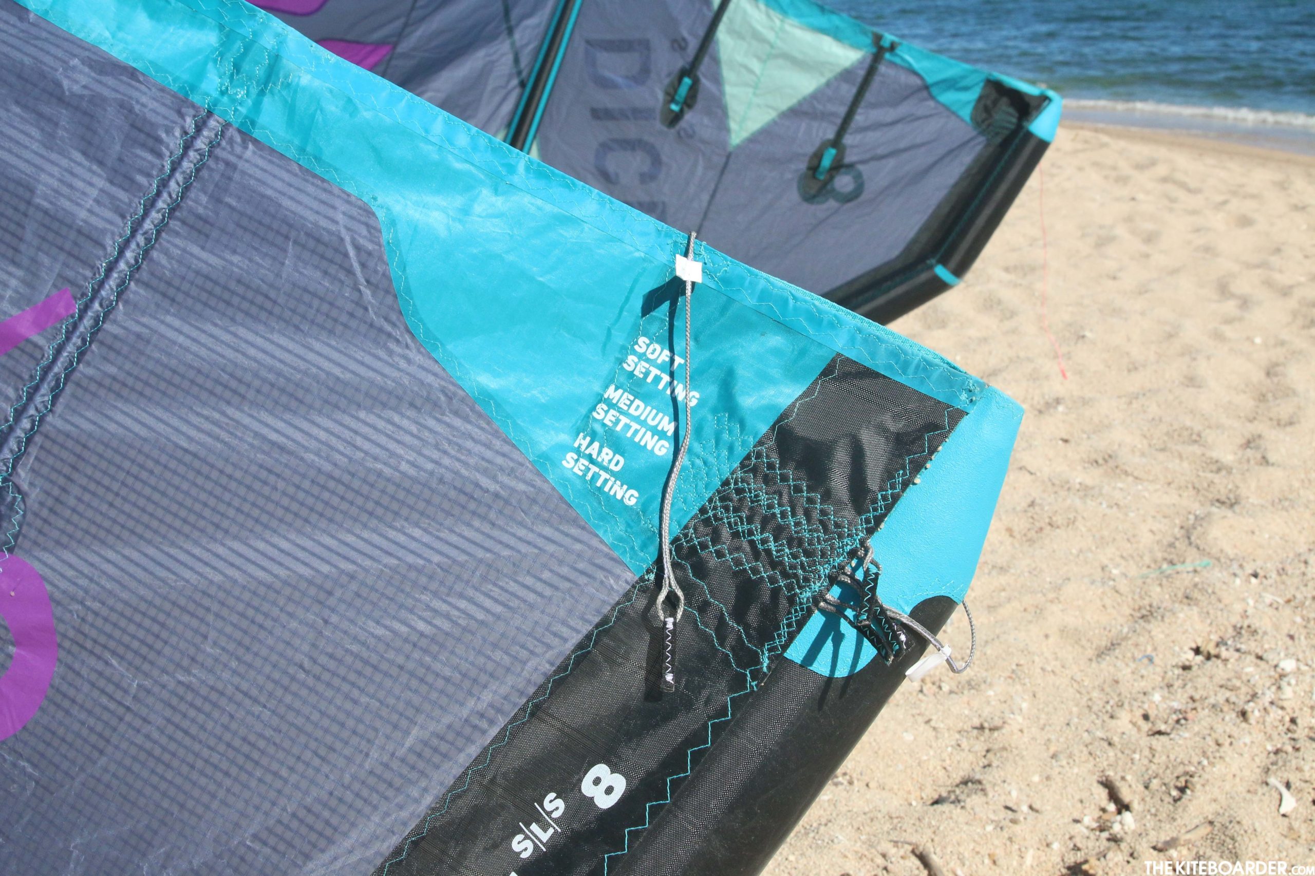 The Dice features a single-setting fixed front bridle that doesn’t use any pulleys or sliders to change its angle of attack. The front bridle attachment points end in a knot and the wingtip attachment pigtails end in lark’s head loops. The bridling on the Dice uses a noticeably thin diameter bridle material for lowered windage and weight and the wingtip offers three attachment points for riders to tune between a ”˜soft, medium and hard’ setting, with the stock mode arriving on ”˜Medium.’ The trailing edge uses six battens along the trailing edge with a heavier ripstop to fortify the leach during more aggressive riding.