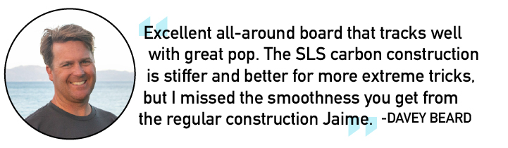 The Jaime has a fairly complex bottom shape with its Double Diffuser bottom that starts with quad channels in the tips and transitions into a center section with a double concave with a center spine. The Jaime uses a board template that tucks the rails into the nose while still providing a boxy tip that is able to launch into explosive airs. The Jaime SLS comes with 4.5 carbon fins in the two smaller sizes and slightly bigger 5.0 fins in the larger sizes. The pads/strap system mounts to the board via a sliding track system that gives you the freedom of finding your perfect stance width setting and the tips feature a bit more flex because the wood core stops short of going all the way into the tips.
